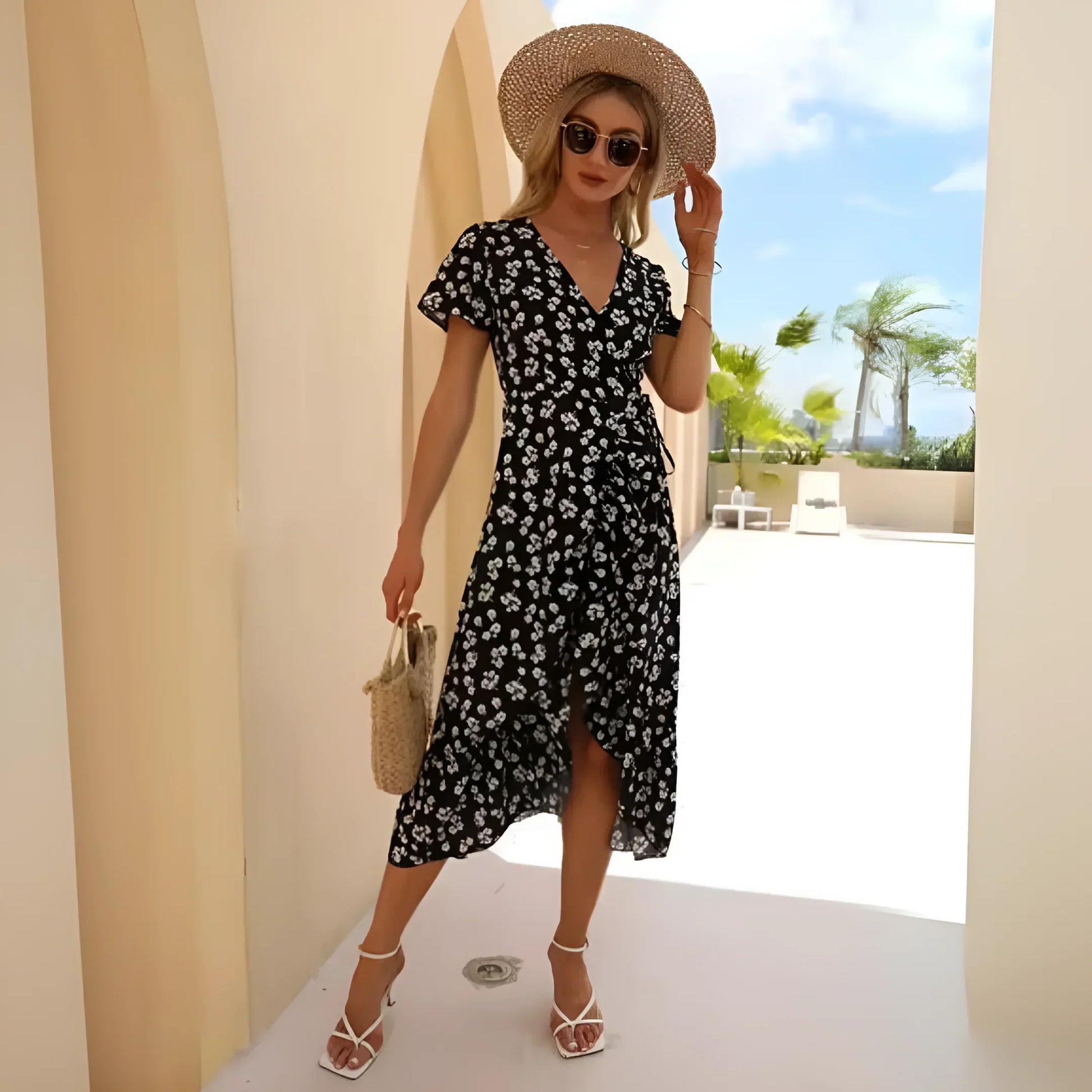 Craquez pour cette robe fluide à col en V, imprimé floral romantique et détails à lacets qui épousent vos formes avec délicatesse. Sa fente asymétrique à volants ajoute une touche de légèreté irrésistible.
